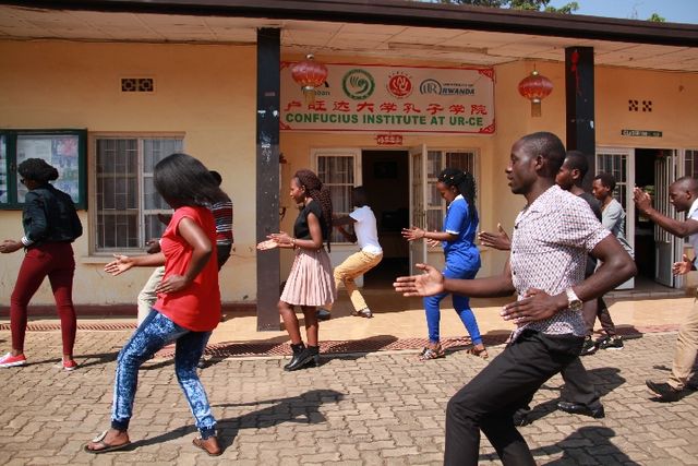 來(lái)到盧旺達(dá)大學(xué)孔子學(xué)院,正趕上老師們帶領(lǐng)參加暑期班的同學(xué)們?cè)诓賵?chǎng)上打太極拳。一招一式,頗有章法。