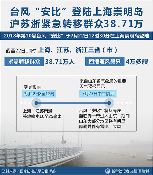 新華社北京7月22日電(記者葉昊鳴、葉婧)記者22日從國(guó)家防汛抗旱總指揮部了解到,今年第10號(hào)臺(tái)風(fēng)“安比”于當(dāng)日12時(shí)30分在上海崇明島登陸。截至22日10時(shí),上海、江蘇、浙江三?。ㄊ校┕簿o急轉(zhuǎn)移群眾38.71萬(wàn)人,有4萬(wàn)多艘船只回港避風(fēng)。