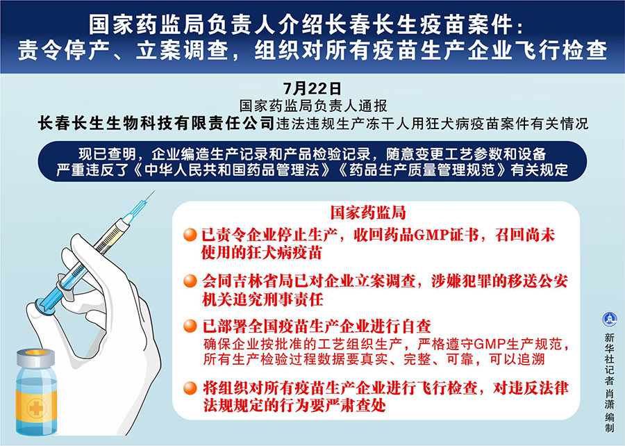 新華社北京7月22日電(記者齊中熙、趙文君)國家藥監(jiān)局負(fù)責(zé)人22日通報長春長生生物科技有限責(zé)任公司違法違規(guī)生產(chǎn)凍干人用狂犬病疫苗案件有關(guān)情況。這位負(fù)責(zé)人說,國家藥監(jiān)局已責(zé)令企業(yè)停止生產(chǎn),收回藥品GMP證書,同時會同吉林省局已對企業(yè)立案調(diào)查,涉嫌犯罪的移送公安機關(guān)追究刑事責(zé)任。國家藥監(jiān)局將組織對所有疫苗生產(chǎn)企業(yè)進行飛行檢查,對違反法律法規(guī)規(guī)定的行為要嚴(yán)肅查處。