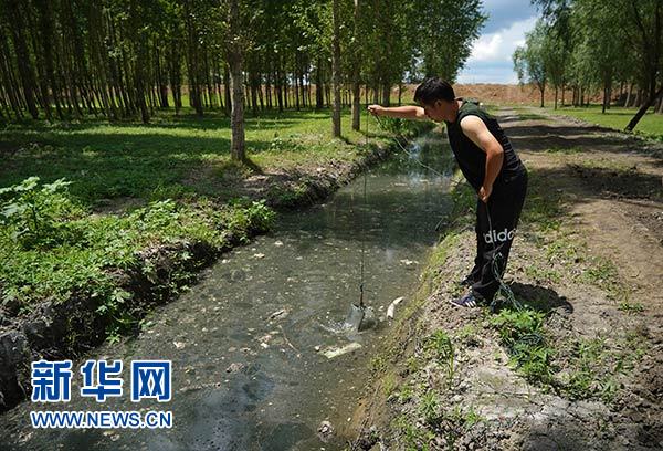 在吉林省長春市,黑臭水體專項(xiàng)督查組工作人員在一處向新凱河排水的水溝采樣(6月28日攝)。 新華社記者 才揚(yáng) 攝