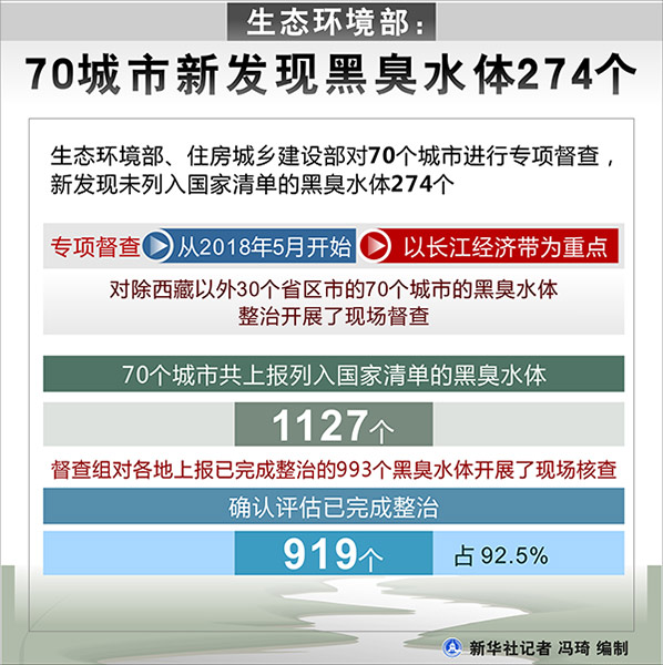 在生態(tài)環(huán)境部當(dāng)天舉行的新聞發(fā)布會上,張波說,專項(xiàng)督查從今年5月開始,以長江經(jīng)濟(jì)帶為重點(diǎn),對除西藏以外30個(gè)省區(qū)市的70個(gè)城市的黑臭水體整治開展了現(xiàn)場督查。70個(gè)城市共上報(bào)列入國家清單的黑臭水體1127個(gè)。督查組對各地上報(bào)已完成整治的993個(gè)黑臭水體開展了現(xiàn)場核查,確認(rèn)評估已完成整治919個(gè),占92.5%。但與此同時(shí),督查還發(fā)現(xiàn)未列入清單的黑臭水體274個(gè)?!氨欢讲槌鞘泻诔羲w完成比例統(tǒng)算起來比例就不高了?!?/p>