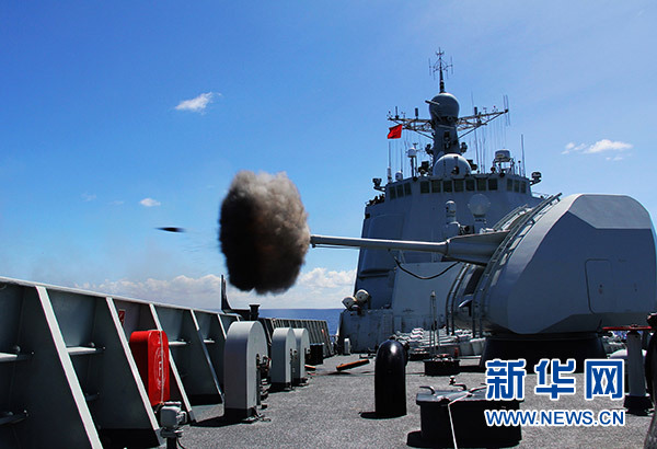 在多國聯(lián)演任務(wù)中,海口艦進行主炮射擊(2014年6月19日攝)。 新華社發(fā)(于林 攝)