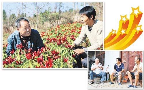 左上圖 張東堂(左)在貧困戶家的辣椒地里查看辣椒長勢。 右下圖 張東堂(左一)來到貧困戶家中家訪。 經(jīng)濟(jì)日報-中國經(jīng)濟(jì)網(wǎng)記者 郭靜原攝