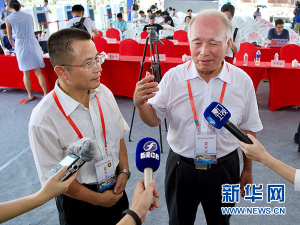 8月5日,在福建晉江舉行的福建向金門供水工程通水現(xiàn)場會(huì)上,來自金門的王再生老人(右)和福建省水投集團(tuán)公司副總經(jīng)理朱金良(左)接受采訪。 新華社記者 姜克紅 攝