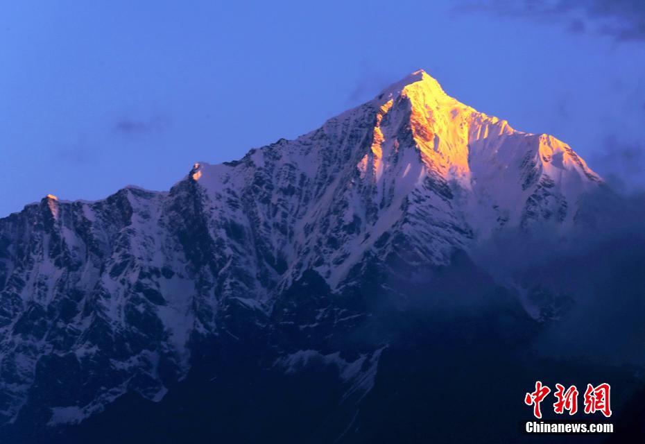 吉隆溝給人最大的感受是驚訝于造物的神奇,讓四季并存在這狹小的山谷間。峽谷綠樹成蔭,恬靜的村莊被綠樹環(huán)抱著,不遠(yuǎn)處能清楚地看見若隱若現(xiàn)的雪山。圖為日照金山——日吾班巴雪山。 楊建 攝