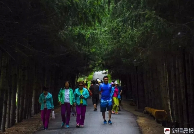 烏蘇佛山國家森林公園待甫僧景區(qū),游客走在綠蔭小道上。圖/新疆經濟報新媒體中心記者 豆興軍
