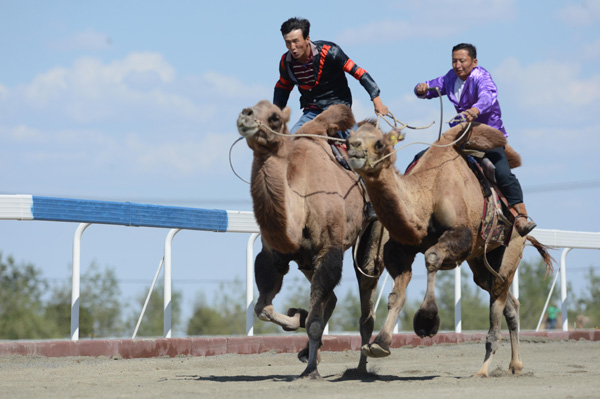 新疆木壘縣民俗旅游文化展示暨賽馬(駱駝)大會的賽駱駝現場。新華社記者 沙達提 攝
