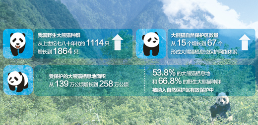 野外調(diào)查顯示,我國野生大熊貓種群從上世紀(jì)七八十年代的1114只增長到1864只,大熊貓自然保護區(qū)從15個增長到67個,形成大熊貓棲息地保護網(wǎng)絡(luò)體系。受保護的大熊貓棲息地面積從139萬公頃增長到258萬公頃,53.8%的大熊貓棲息地和66.8%的野生大熊貓種群被納入自然保護區(qū)有效保護中。