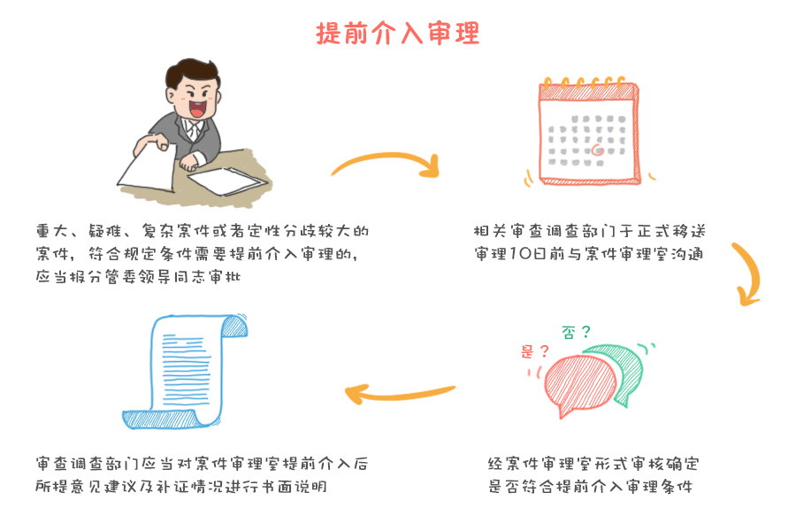 以提前介入審理為例,該規(guī)范明確,對于重大、疑難、復雜案件或者對違紀行為性質認定分歧較大的案件,符合規(guī)定條件需要提前介入審理的,相關審查調查部門應當在報分管委領導同志審批后,于正式移送審理10日前與案件審理室溝通,經案件審理室形式審核確定是否符合提前介入審理條件。審查調查部門應當對案件審理室提前介入后所提意見建議及補證情況進行書面說明。