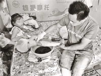 欣欣側(cè)身坐臥在床上,戴著塑膠手套的張志成正在為女兒換藥。右腿膝蓋后窩處的傷口面積很大,夏天化膿尤為嚴(yán)重,平常清洗創(chuàng)面、換藥這些事對(duì)張志成來(lái)說(shuō)已經(jīng)輕車(chē)熟路了。懂事的欣欣沒(méi)有哭鬧,也沒(méi)有喊疼。