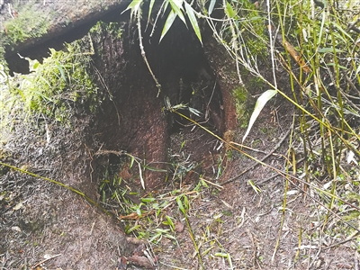 在熊貓幼崽玩耍的樹下,隊員們發(fā)現(xiàn)了一個樹洞。根據(jù)大熊貓的生活習性,隊員們初步判定這可能是熊貓產(chǎn)仔時用的樹洞,被發(fā)現(xiàn)的這只幼崽有可能就是在此處被產(chǎn)下的。在樹干上有一些動物留下的抓痕,本被綠色植被包圍的樹干上有幾塊變得光禿禿的,隊員用手測量了大概的尺寸,根據(jù)抓痕的范圍及新鮮程度,判斷很可能是大熊貓爬樹的痕跡。