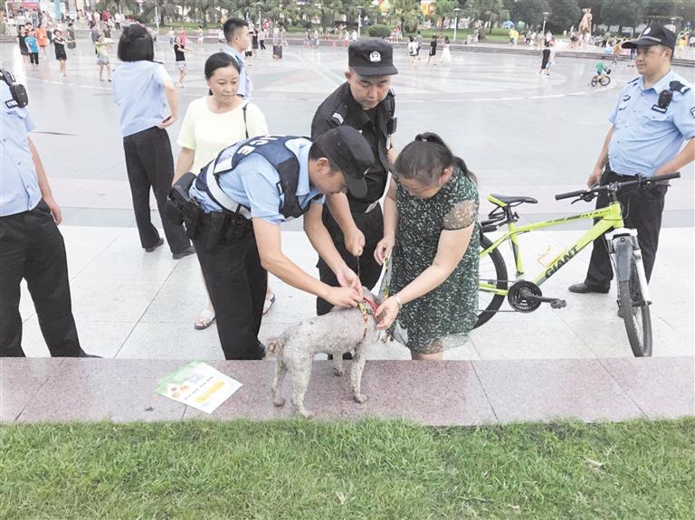 傍晚時(shí),蒲江縣世紀(jì)廣場(chǎng)很是熱鬧,是市民們飯后休閑娛樂(lè)散步的集中地,其中也不乏帶著愛犬出來(lái)散步的市民。蒲江縣公安局巡防大隊(duì)民警走上街頭,現(xiàn)場(chǎng)對(duì)沒(méi)有為愛犬套上牽引繩的市民進(jìn)行勸導(dǎo)并免費(fèi)發(fā)放牽引繩。面對(duì)民警的勸導(dǎo)和發(fā)放牽引繩的執(zhí)法方式,市民們紛紛點(diǎn)贊,“人性化的執(zhí)法方式在宣傳文明養(yǎng)犬重要性的同時(shí),也讓市民們更易接受,從實(shí)際出發(fā)緩和了矛盾,值得推廣!”