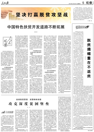 全面建成小康社會,一個也不能少。黨的十八大以來,以習(xí)近平同志為核心的黨中央圍繞脫貧攻堅作出一系列重大部署和安排,全面打響脫貧攻堅戰(zhàn),拓展了中國特色扶貧開發(fā)道路,脫貧攻堅取得決定性進(jìn)展。黨的十九大明確把精準(zhǔn)脫貧作為決勝全面建成小康社會必須打好的三大攻堅戰(zhàn)之一,作出了新的部署。《中共中央國務(wù)院關(guān)于打贏脫貧攻堅戰(zhàn)三年行動的指導(dǎo)意見》為推動脫貧攻堅工作更加有效開展進(jìn)一步完善頂層設(shè)計、強化政策措施、加強統(tǒng)籌協(xié)調(diào)。在未來兩年多時間里,如何攻克深度貧困堡壘,實現(xiàn)穩(wěn)定脫貧不返貧,讓中國特色扶貧開發(fā)道路越走越寬廣?本期觀察版圍繞這些問題進(jìn)行探討。