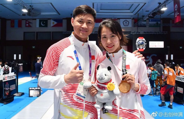 雷聲與獲得亞運(yùn)會(huì)女花個(gè)人銀牌的傅依婷。