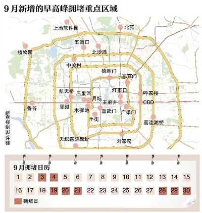 昨日上午,北京市交通委緩堵處、北京交通發(fā)展研究院相關(guān)負責人做客交通廣播“治堵大家談”節(jié)目時介紹,今年“最堵9月”預(yù)計會有8個重點擁堵日,主要集中在9月初和9月末,9月平均出行時間會比8月多花費50%。同時,還公布了本市包括五道口區(qū)域、CBD區(qū)域等7個一級堵點。