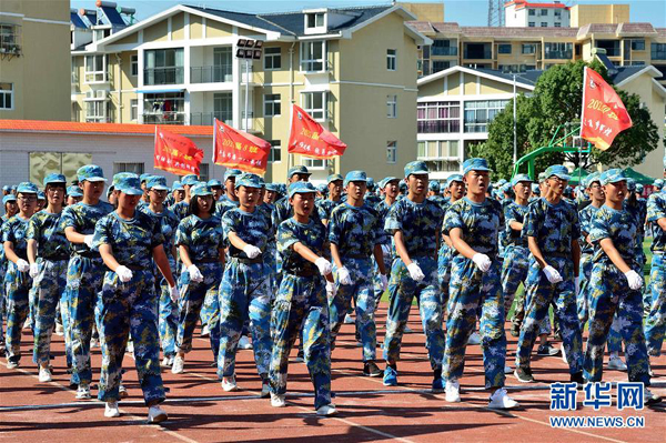 8月28日,新生在湖北省襄陽市??悼h第一中學(xué)參加軍訓(xùn)。新華社發(fā)(楊韜 攝)