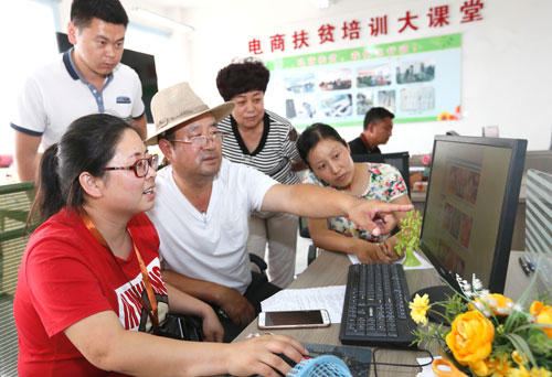 電商培訓(xùn)中心工作人員(前左)在指導(dǎo)貧困戶通過網(wǎng)絡(luò)銷售農(nóng)產(chǎn)品