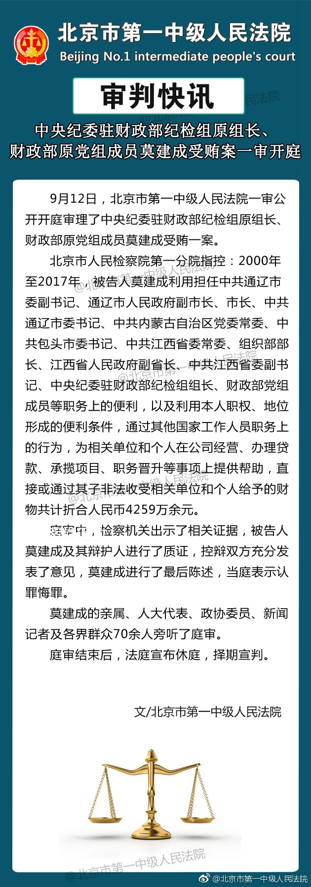 據(jù)北京市第一中級人民法院官方微博消息,9月12日,北京市第一中級人民法院一審公開開庭審理了中央紀(jì)委駐財政部紀(jì)檢組原組長、財政部原黨組成員莫建成受賄一案。