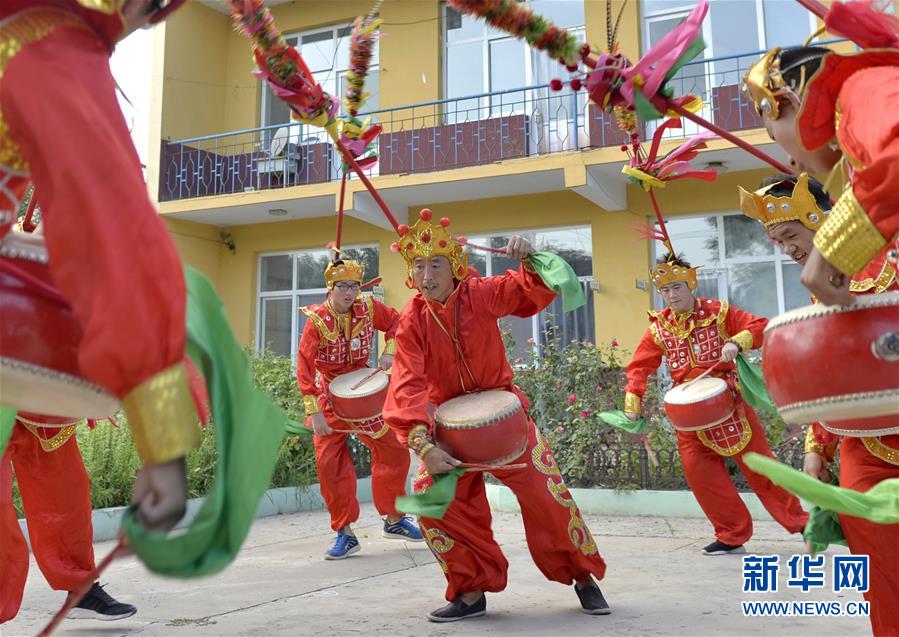 招子鼓藝人(中)為隆堯縣滏陽(yáng)中學(xué)學(xué)生教授招子鼓表演技巧