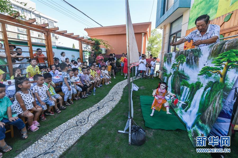 長(zhǎng)興縣71歲的提線木偶藝人蔣晚寶在給孩子們表演提線木偶劇“哪吒鬧海”