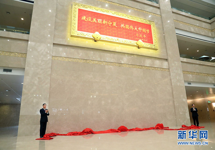 9月19日,中共中央政治局常委、全國政協(xié)主席、中央代表團(tuán)團(tuán)長汪洋率中央代表團(tuán)出席向?qū)幭幕刈遄灾螀^(qū)贈(zèng)送紀(jì)念品儀式。這是汪洋和寧夏回族自治區(qū)黨委書記、人大常委會(huì)主任石泰峰一同為習(xí)近平總書記題詞賀匾揭幕。 新華社記者 劉衛(wèi)兵 攝