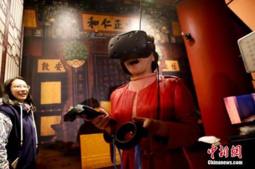 資料圖:"發(fā)現(xiàn)·養(yǎng)心殿——主題數(shù)字體驗(yàn)展”在故宮端門(mén)數(shù)字館全新亮相。圖為運(yùn)用VR技術(shù)參觀養(yǎng)心殿。中新社記者 杜洋 攝