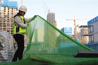 今年2月,中國鐵物大廈項目工地配備網(wǎng)眼更細密的防塵網(wǎng),有助更好控制揚塵污染。 資料圖片/新京報記者 吳江 攝