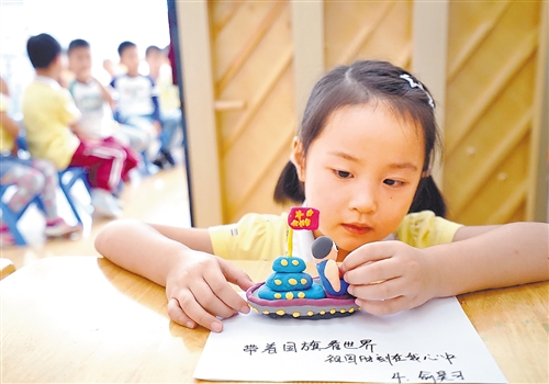 圖⑥ 9月30日,安徽省肥東縣實驗幼兒園御景部開展親子泥塑創(chuàng)意活動,孩子們用彩泥制作國旗慶佳節(jié)。許慶勇 攝