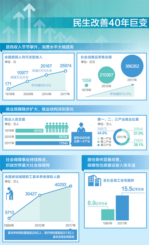 改革開放40年,是我國(guó)經(jīng)濟(jì)飛速發(fā)展、經(jīng)濟(jì)總量連上新臺(tái)階的40年,也是全體人民共享改革發(fā)展成果、生活水平大幅提高的40年。黨的十八大以來,以習(xí)近平同志為核心的黨中央堅(jiān)持以人民為中心的發(fā)展思想,統(tǒng)籌做好就業(yè)、收入分配、社會(huì)保障、醫(yī)療衛(wèi)生等各領(lǐng)域民生工作,城鄉(xiāng)居民生活向全面小康社會(huì)更加扎實(shí)地邁進(jìn)。人民群眾的獲得感、幸福感、安全感更充實(shí)、更有保障、更可持續(xù)。