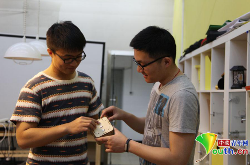 清華大學(xué)創(chuàng)客空間協(xié)會成員張承巍(左)與畢瀅(右)正在介紹他們的創(chuàng)意成果“音樂盒子”。資料圖