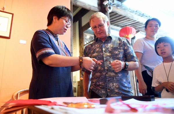 10月3日,在福建福州三坊七巷舉行的非遺剪紙展上,福州楊橋中學(xué)英語老師潘力鷹(左)在向美國(guó)客人講解中國(guó)的民間剪紙藝術(shù)。當(dāng)日是國(guó)慶假期的第三天。新華社記者 林善傳攝