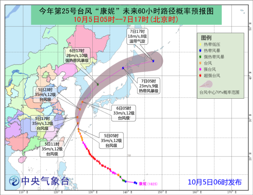 受“康妮”和冷空氣的共同影響,我國東部海域將有較大風雨,其中5日08時到6日08時,黃海南部、東海、臺灣東北洋面、浙江東部及沿海、上海沿海、江蘇沿海、杭州灣、長江口區(qū)將有7-10級大風,其中東海大部、黃海東南部的風力可達11級,“康妮”中心經過的東海東北部部分海域風力可達12級,陣風13-14級,浙江東北部、上海東部局地有中到大雨。為此,中央氣象臺10月5日06時繼續(xù)發(fā)布臺風藍色預警。