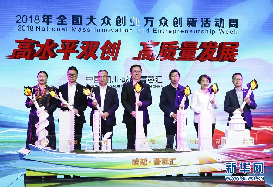 10月9日,2018年全國(guó)大眾創(chuàng)業(yè)萬(wàn)眾創(chuàng)新活動(dòng)周在四川成都拉開(kāi)帷幕。中共中央政治局常委、國(guó)務(wù)院副總理韓正出席啟動(dòng)儀式并講話(huà)。這是在啟動(dòng)儀式上,韓正與創(chuàng)新創(chuàng)業(yè)者代表共同啟動(dòng)活動(dòng)周。 新華社記者 龐興雷 攝