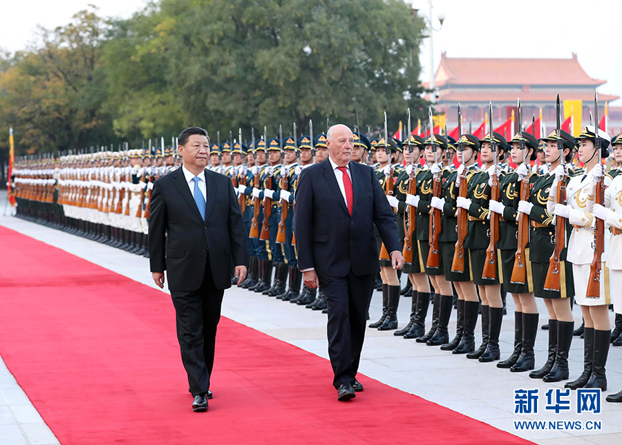 10月16日,國家主席習(xí)近平在北京人民大會(huì)堂同挪威國王哈拉爾五世舉行會(huì)談。這是會(huì)談前,習(xí)近平在人民大會(huì)堂東門外廣場(chǎng)為哈拉爾五世舉行歡迎儀式。 新華社記者 劉衛(wèi)兵 攝