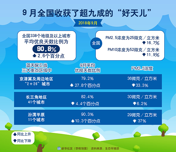新華社北京10月18日電(記者高敬)生態(tài)環(huán)境部有關(guān)負(fù)責(zé)人18日通報(bào),今年9月,全國(guó)338?jìng)€(gè)地級(jí)及以上城市平均優(yōu)良天數(shù)比例為90.8%,同比上升2.6個(gè)百分點(diǎn)。