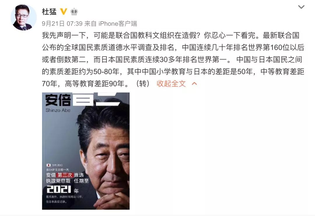 2018年9月21日,擁有近220萬粉絲的大V“杜猛”一大清早就發(fā)布了一條微博:“最新聯合國公布的全球國民素質道德水平調查及排名,中國連續(xù)幾十年排名世界第160位以后或者倒數第二,而日本國民素質連續(xù)30多年排名世界第一。中國與日本國民之間的素質差距約為50-80年,其中中國小學教育與日本的差距是50年,中等教育差距70年,高等教育差距90年?!彼m然在微博的最后加了個括號寫了個“轉”字,但并未寫明來源。配圖內容是:前一天,安倍晉三第三次當選日本執(zhí)政黨總裁。