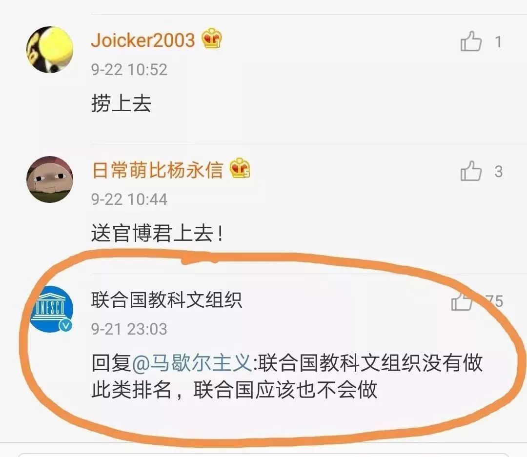 諷刺的是,“杜猛”還在微博最開始加了句“我先聲明一下,可能是聯合國教科文組織在造假?你忍心一下看完。”結果聯合國教科文組織的官方微博當天就出來“強力打臉”,聲明“聯合國教科文組織沒有做此類排名,聯合國應該也不會做。”這條微博被多名網友舉報,微博管理方最后對其做了“不實”的標記,對博主禁言15天,但這條假消息并未被刪,仍然掛在那里,甚是刺眼。而作者在被處理前還接著轉發(fā)了好幾條貶低中國的評論。