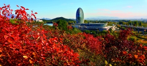 金海湖景區(qū)是彩葉樹種造林工程實施重點景區(qū)之一,彩葉樹種豐富,黃櫨、紅櫨、元寶楓、火炬、紅葉臭椿、黃金槐等多個品種在秋日陽光的照射下紅黃綠相間,五彩繽紛,絢麗耀眼,一路秋色,令人陶醉。