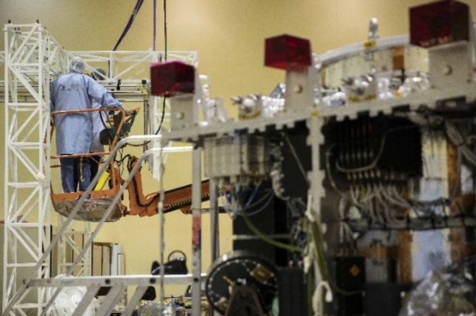 2018年8月31日,在位于巴西圣保羅州圣若澤杜斯坎普斯市的巴西國家空間研究所,工作人員在中巴地球資源04A衛(wèi)星旁工作。新華社記者李明攝