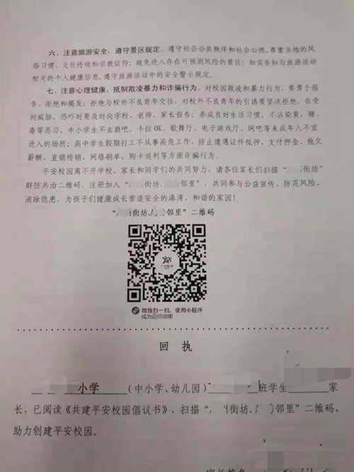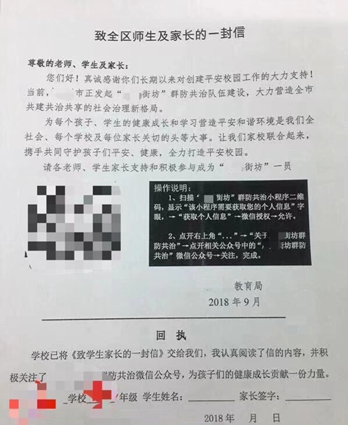 前不久,廣東某地發(fā)起“街坊群防共治隊伍建設”,并開設了微信公眾號。當?shù)亟逃忠浴吨氯珔^(qū)師生及家長的一封信》的形式,要求師生和家長關注其公眾號,并要求學生及家長簽名承諾“關注”。