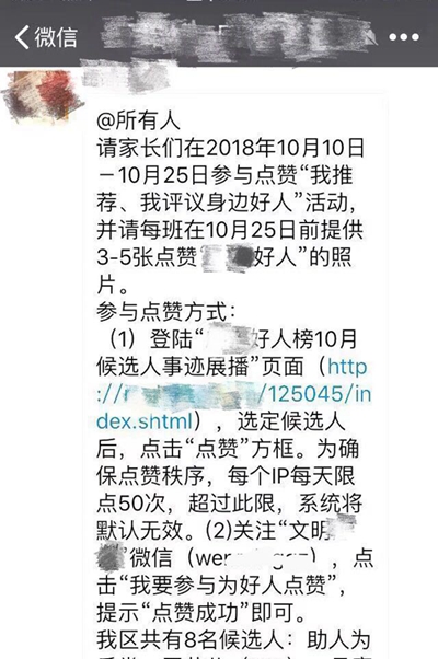 近日,廣東某所幼兒園的家長們又在群里收到老師發(fā)的通知:“請家長們在2018年10月10日-10月25日參與點贊‘我推薦、我評議身邊好人’活動,并請每班在10月25日前提供3-5張點贊的照片。”