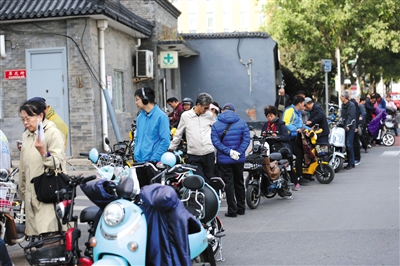 10月10日,西城交通支隊(duì)北區(qū)非機(jī)動(dòng)車登記站,市民“扎堆兒”等待給電動(dòng)自行車登記牌照。資料圖片/新京報(bào)記者 王貴彬 攝