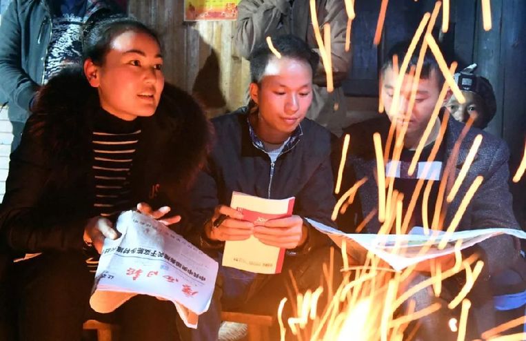 基層干部徐秋華(左)帶領(lǐng)廣西融水苗族自治縣四榮鄉(xiāng)榮地村村民學(xué)習(xí)“鄉(xiāng)村振興戰(zhàn)略”精神 張愛林 攝