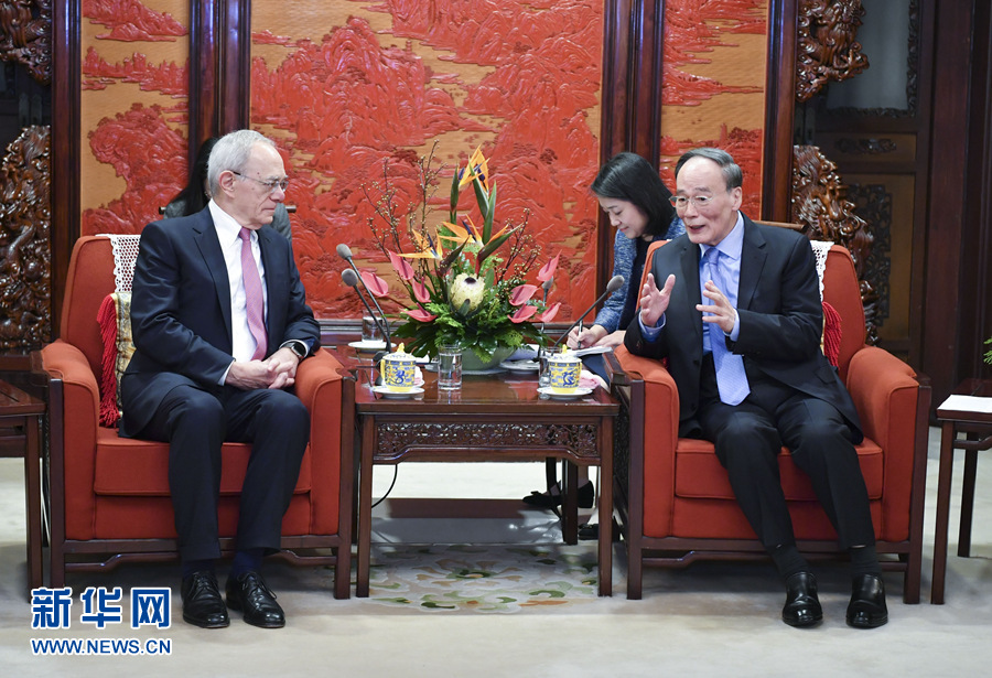11月12日,國(guó)家副主席王岐山在北京中南海會(huì)見校長(zhǎng)里夫率領(lǐng)的麻省理工學(xué)院理事會(huì)執(zhí)委會(huì)成員。 新華社記者 殷博古 攝