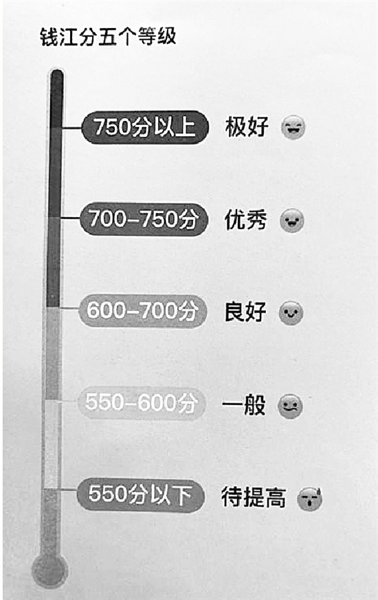 “錢江分”采用千分制,共分5個等級:當用戶分數(shù)低于550分,信用待提高;550~600分信用一般;600~700分信用良好;700~750信用優(yōu)秀;750分以上用戶信用極好。