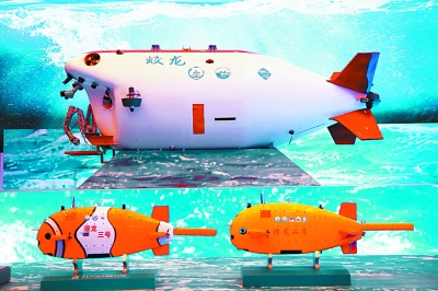 “可上九天攬?jiān)拢上挛逖笞谨M”。一邊是航天技術(shù)展區(qū),一邊是航海技術(shù)展區(qū),完美對(duì)應(yīng)著詩(shī)句,一上一下,延展著人類對(duì)于世界的認(rèn)知和想象。天宮二號(hào)空間實(shí)驗(yàn)室、嫦娥三號(hào)月球探測(cè)器以及蛟龍、海龍、潛龍“三龍兄弟”深海探測(cè)裝備模型,讓很多在場(chǎng)的孩子發(fā)出贊嘆之聲。