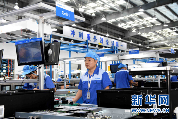 員工們在浪潮高端容錯(cuò)計(jì)算機(jī)產(chǎn)業(yè)基地生產(chǎn)服務(wù)器(6月14日攝)。新華社記者 朱崢攝