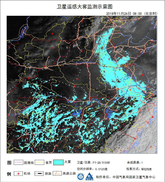 圖為FY-2G氣象衛(wèi)星大霧監(jiān)測示意圖像 2018年11月26日08:00(北京時)