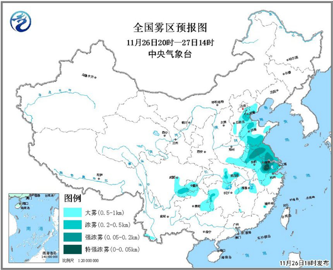 馬學款:根據(jù)實況監(jiān)測數(shù)據(jù),11月26日早上,河北中南部、北京東南部、天津、山東中西部、河南中東部、安徽中北部等地出現(xiàn)濃霧或中到重度霾;河北、河南、山東、安徽等地部分地區(qū)有能見度不足50米的特強濃霧。26日晚上起,受冷空氣影響,華北平原大霧逐漸減弱或消散。