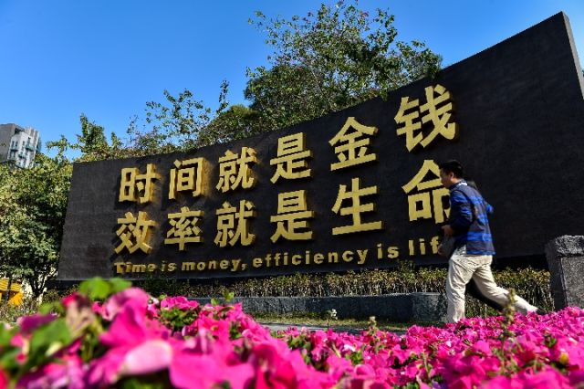圖為“時間就是金錢,效率就是生命”紀(jì)念牌,目前位于廣東省自貿(mào)區(qū)深圳前海蛇口片區(qū)。新華社記者 毛思倩 攝